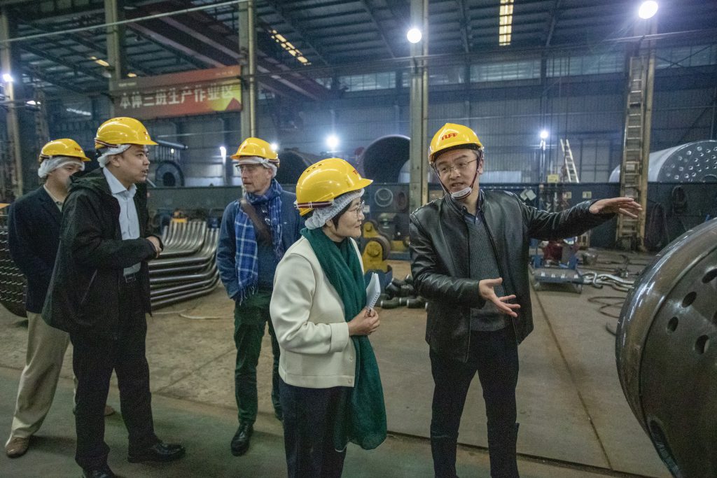 在进入会议交流环节前,考察组一行走进特富生产车间进行实地参观。当前,特富海宁工厂正处于扩建与搬迁同步推进阶段,现场呈现出一派紧张而有序的繁忙景象。GEF专家对这种“发展中的现场”印象深刻,也更直观地体现了企业的活力与成长性。